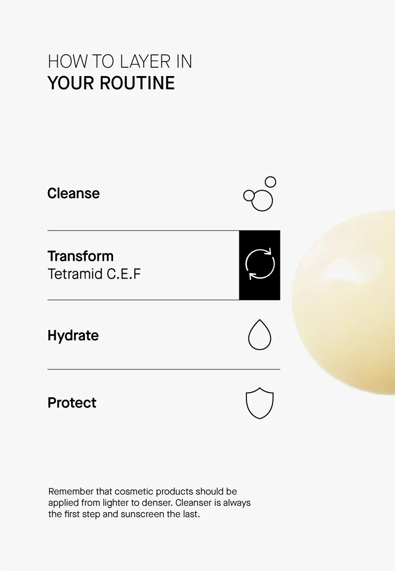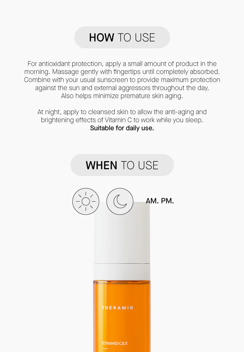 - Formuluar për për të ofruar mbrojtje optimale nga radikalet e lira, për të rritur shkëlqimin e lëkurës dhe për të targetuar imperfeksionet nga fotoplakja.