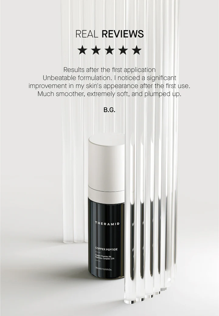 Formula e Cooper Peptide përmban 3% peptide bakri, përqëndrimi më i lartë dhe më i pastër i peptideve të bakrit që ekziston në treg, për të ndihmuar në stimulimin e prodhimit të kolagjenit dhe elastinës, duke përmirësuar dhe reduktuar rrudhat, qëndrueshmërinë dhe elasticitetin. Gjithashtu ofron veti antioksiduese që ndihmojnë në mbrojtjen e lëkurës nga radikalet e lira dhe stresi oksidativ, të cilat shkaktojnë dëmtime të qelizave dhe plakje të parakohshme të lëkurës. Përveç kësaj, përshpejton dhe stimulon proceset e riparimit dhe shërimit të lëkurës. Pra, jo vetëm që përmirëson pamjen e rrudhave dhe linjave të shprehjes, por edhe parandalon shfaqjen e tyre.