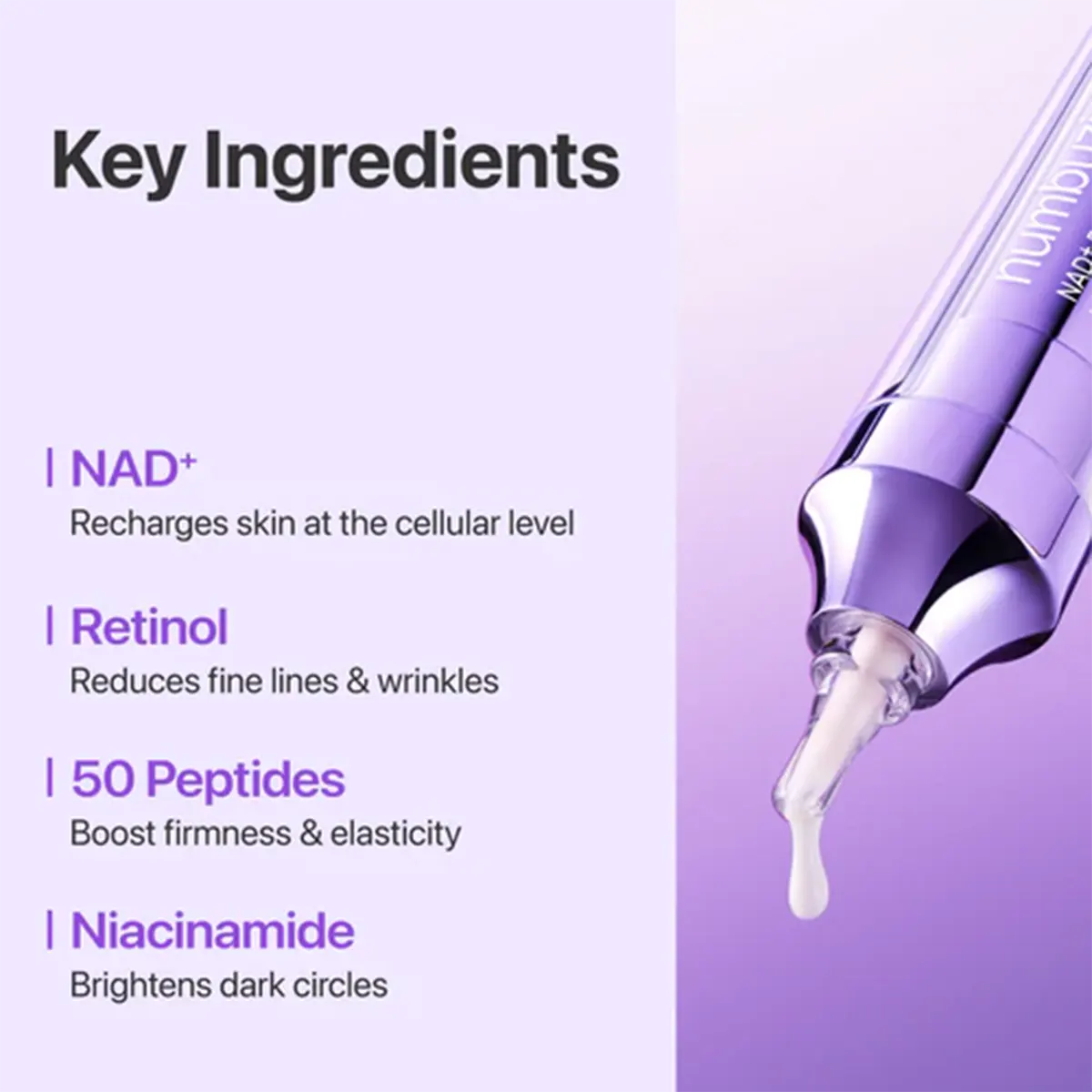 Ky krem për zonën e syve ndihmon në përmirësimin e pamjes së syve të lodhur, duke reduktuar rrathët e zinj, vijat e holla dhe humbjen e elasticitetit. Formula e avancuar me Retinol, 50 Peptide, Niacinamide, Ceramide dhe NAD+ ofron hidratim, forcim të barrierës së lëkurës dhe efekt firmues për një pamje më të re dhe të freskët.