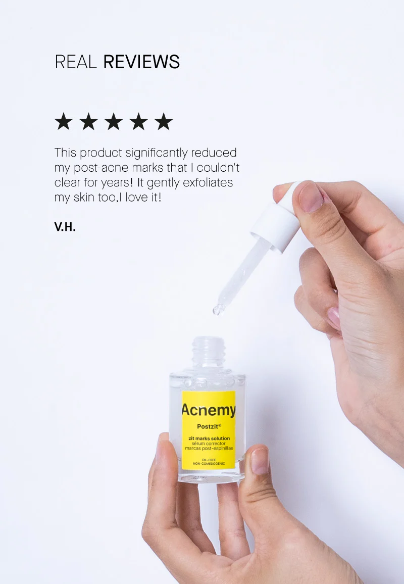 Oh shkëlqyeshëm, akne qenka zhdukur! Dhe çfarë të bëjmë me ato shenja të kuqe të lëna nga aknet? Nuk ka nevojë të shqetësoheni, sepse ju keni Postzit® në skuadrën tuaj. Serumi është i formuluar me acidin glikolik që minimizon shenjat pas akneve (hiperpigmentimet), përmirëson teksturën e lëkurës dhe unifikon tonin/ngjyrën e lëkurës. Dhe në rast se ka ende ndonjë akne kokëfortë në lëkurë, ne kemi shtuar në formulë dhe acid salicilik dhe quora noni PRCF, hakerin e vërtetë të baktereve p.acnes, i cili shkakton aknet, duke i penguar ato të riprodhohen dhe të ribalancojnë mikrobiomën e lëkurës.