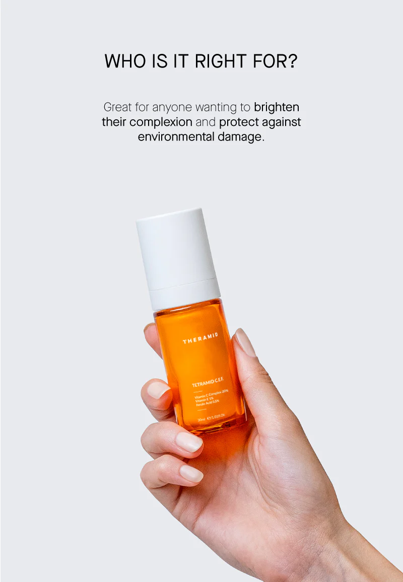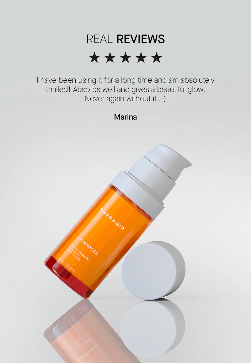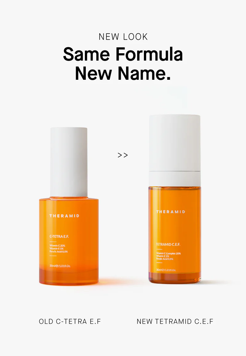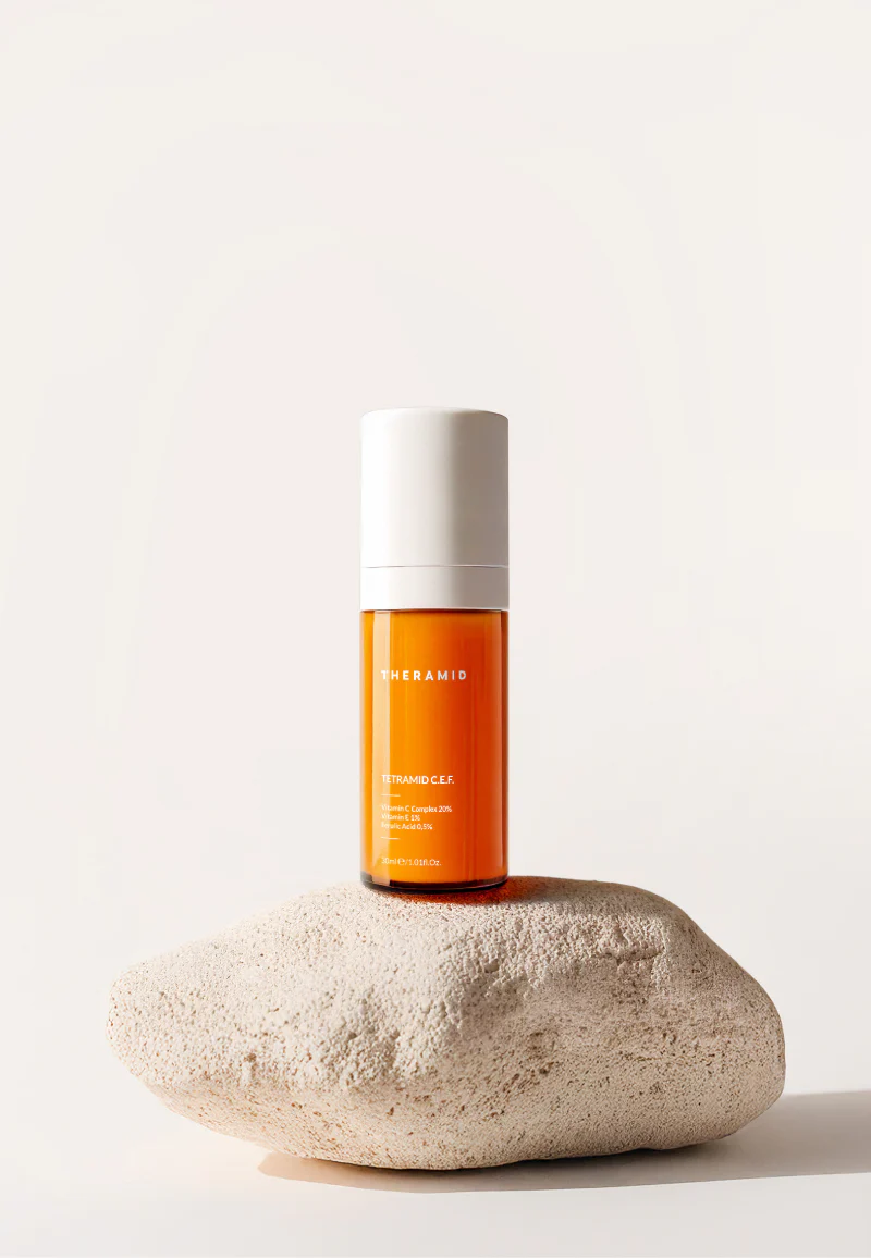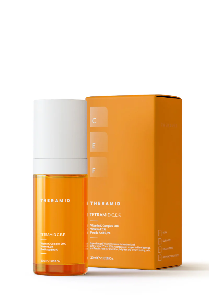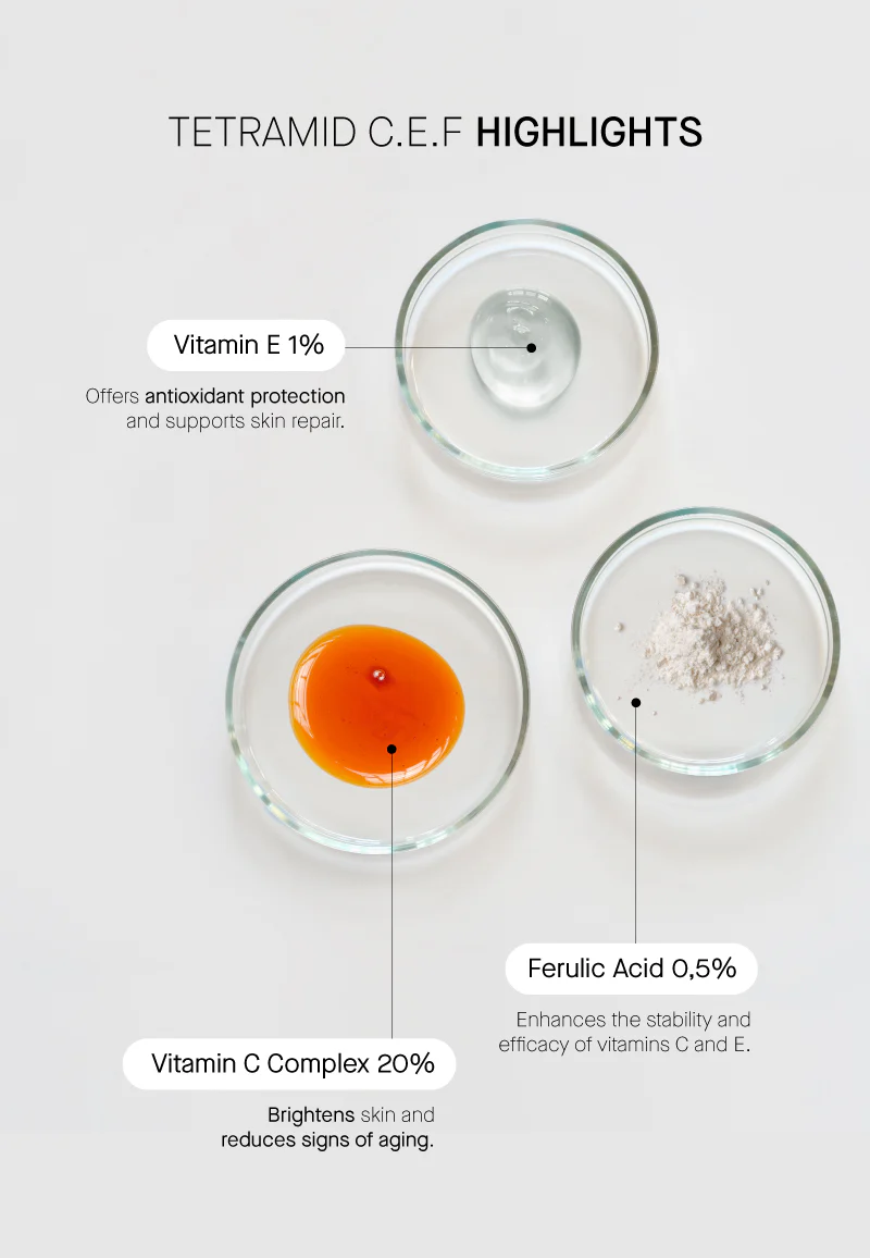TETRAMID C.E.F. është formuluar me 10% Vitaminë C Tetra, e cila është shumë biokompatibile dhe e tretshme ne vaj. Fakti që është i tretshëm në vaj lejon që kjo lloj vitamine C të transportohet deri në shtresat më të thella të lëkurës. Këtu, veprimi i tij fokusohet tek melanocitet (për të trajtuar njollat nga brenda) dhe në sintezën e kolagjenit (për të parandaluar dhe luftuar rrudhat nga brenda).